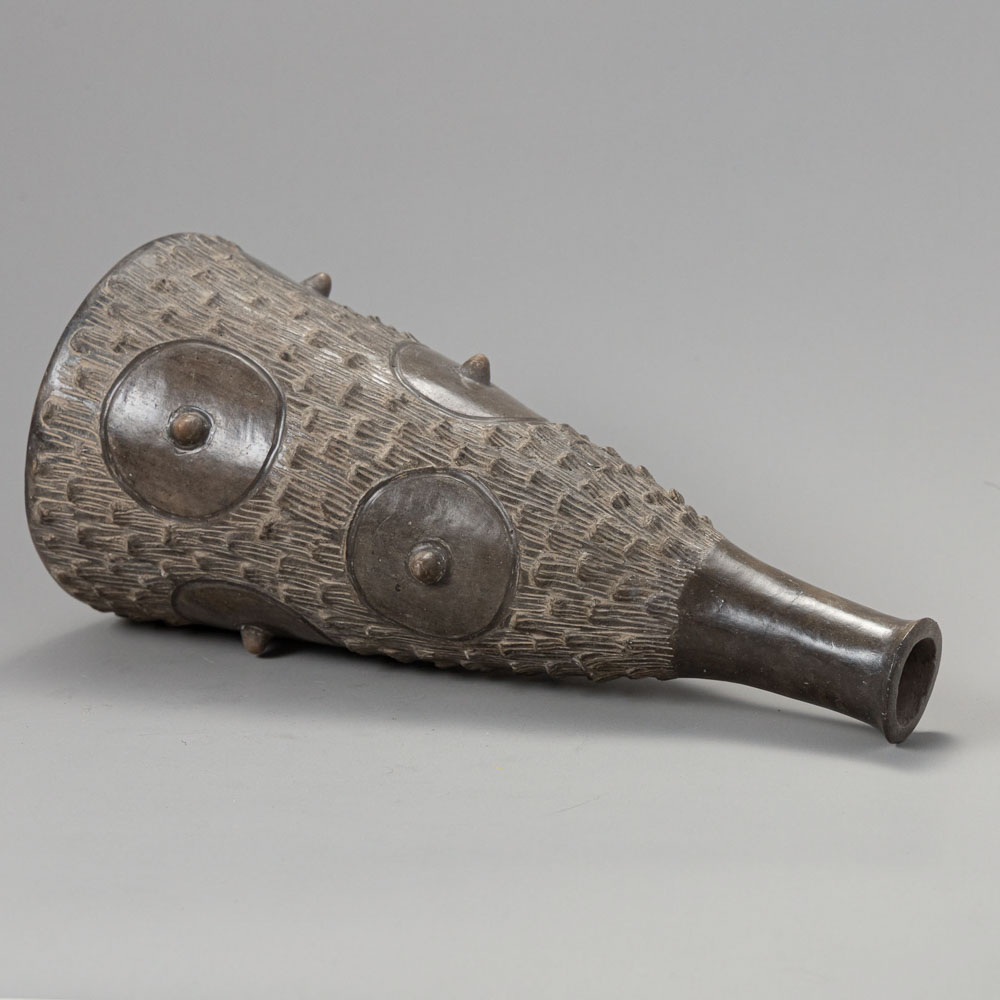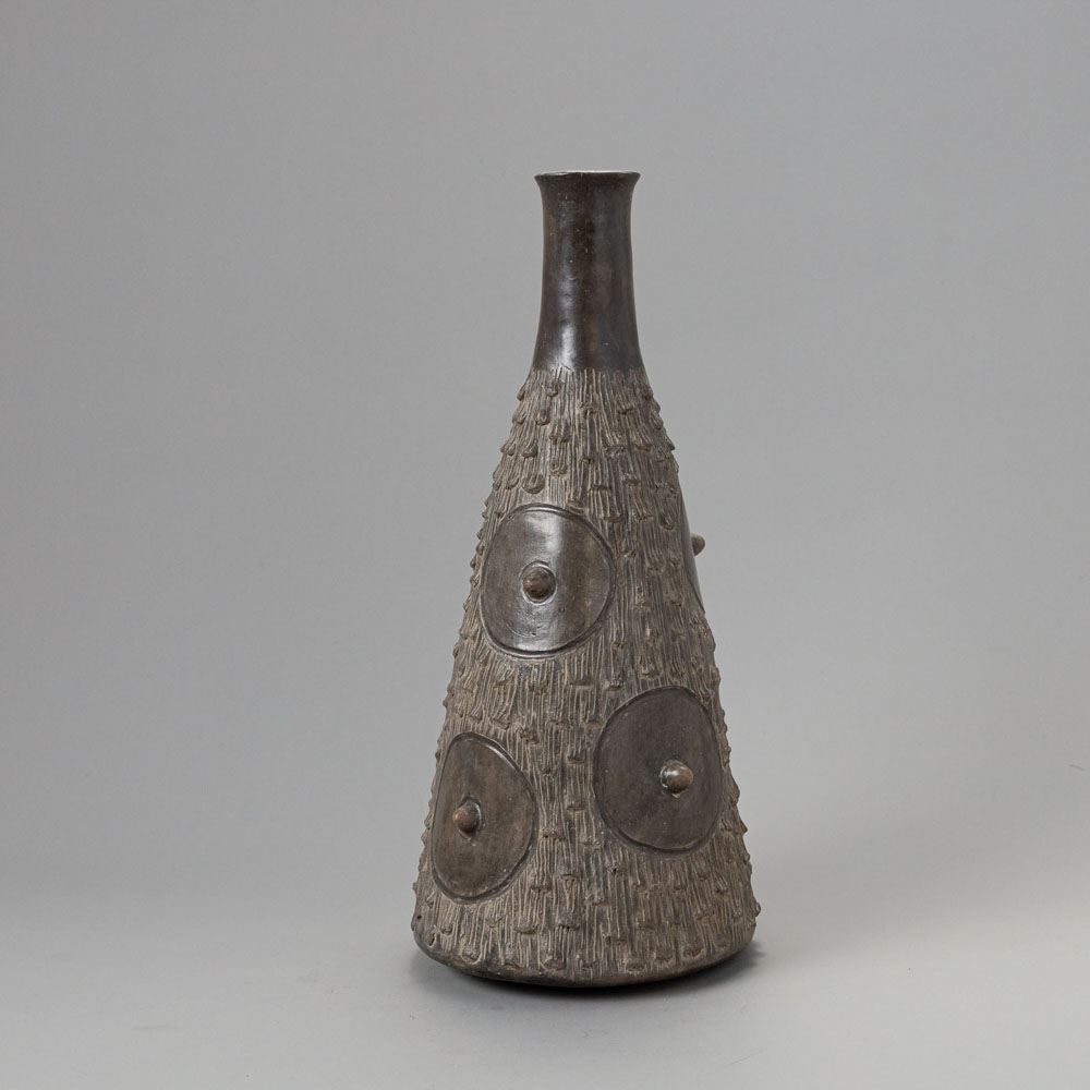 Description: The Chavín Ceramic Vessel is an elegant artifact from the Chavín culture, crafted from ceramic. It features a conical body adorned with a textured surface and raised circular elements, culminating in a smooth neck. This vessel exemplifies the intricate artistry of the Northern Andes, reflecting its cultural significance in ceremonial practices.
