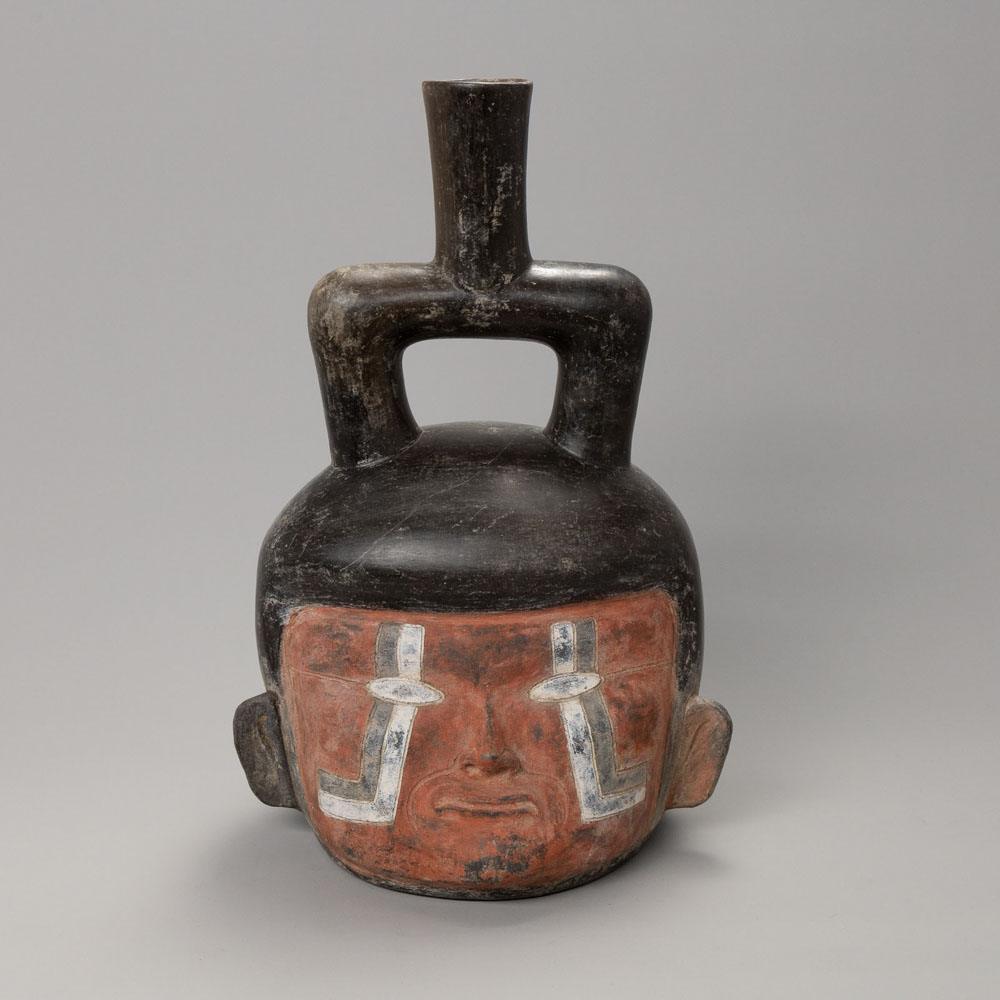 Description: The Chavín Ceramic Stirrup Vessel features a distinctive design with a stylized human face, characterized by white markings against a dark reddish-brown background. The vessel is shaped with a stirrup handle, embodying the artistic traditions of the Chavín culture from the Northern Andes. This piece reflects the ceremonial practices and craftsmanship of its time.