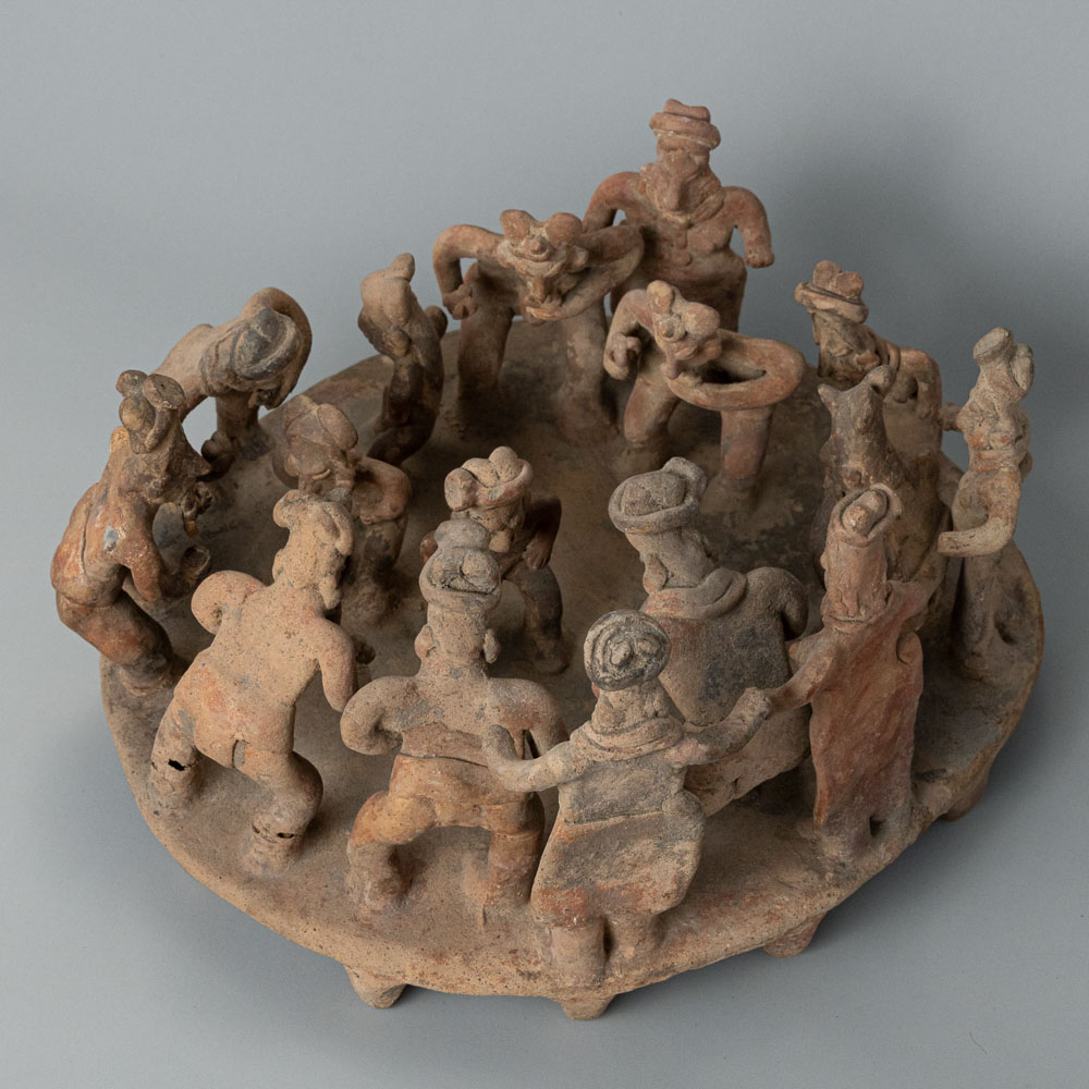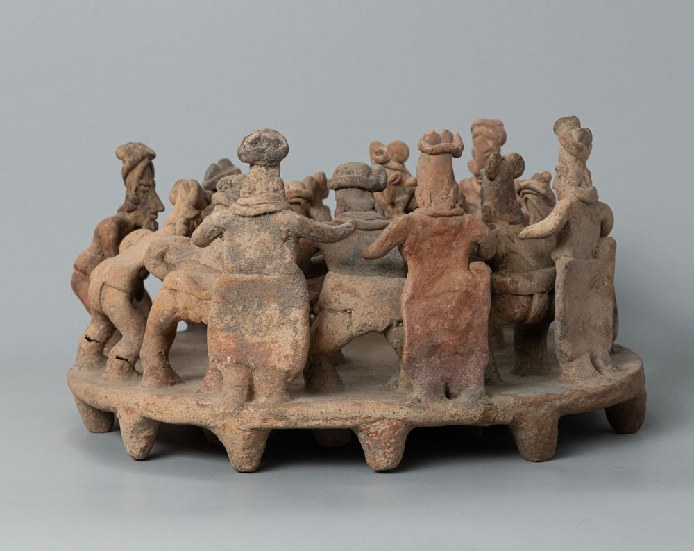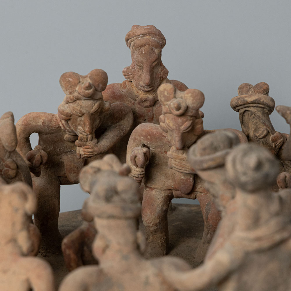 Description: The Colima Pottery Figures are ceramic sculptures from the Colima culture in West Mexico. These figures depict stylized human forms arranged in a communal gathering, often showcasing expressive faces and intricate details. Their design reflects the cultural practices and social interactions within Colima society, highlighting the significance of community and ritual in their artistic expressions.