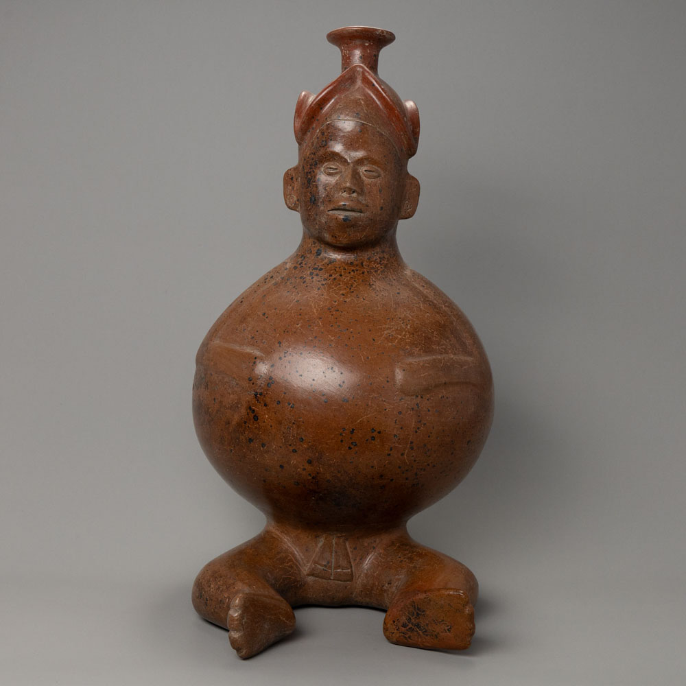 Description: The Colima Ceramic Figure is a remarkable artifact from the Colima culture in West Mexico. This reddish-brown figure features a bulbous, vessel-like body and an ornate headdress, showcasing the unique artistic style of the region. Its design reflects both aesthetic and cultural significance, highlighting the craftsmanship of Colima artisans during the period.