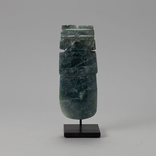 Description: Finely polished deep blue jadeite celt of classic form with broad blade and subtly defined upper register. The rich coloration and high polish are characteristic of Guanacaste-Nicoya jade working traditions. Likely used as a ceremonial or prestige object, emphasizing status and authority.