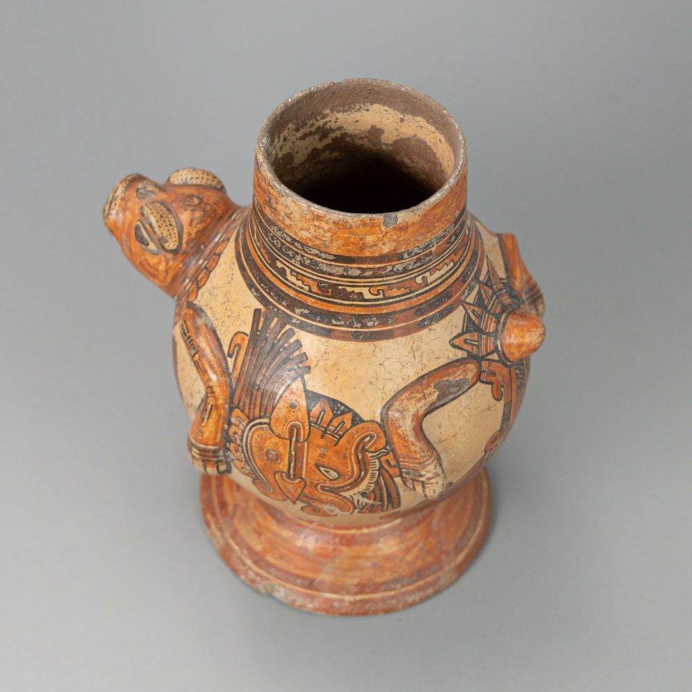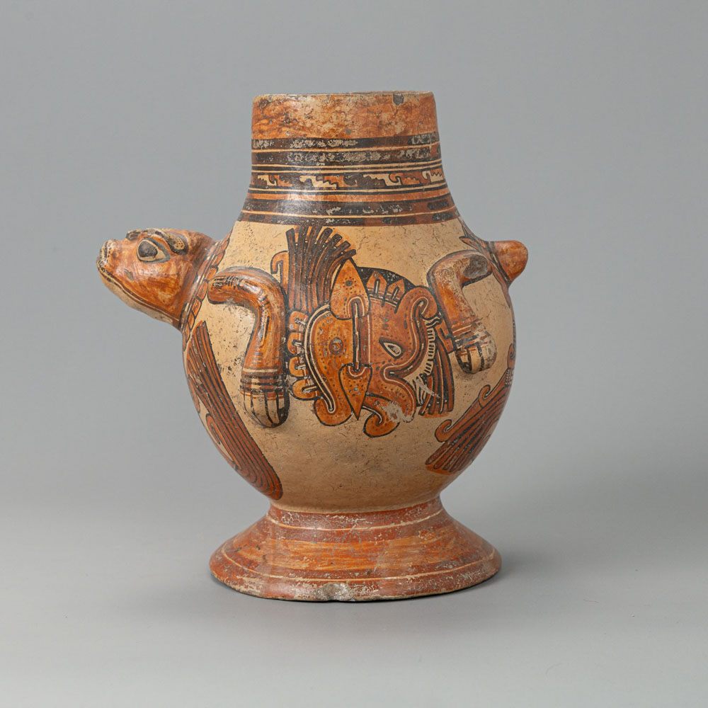 Description: The Guanacaste-Nicoya Terracotta Vase is a pre-Columbian artifact from the Guanacaste-Nicoya culture in Costa Rica. This zoomorphic vessel features two prominent fish heads on its bulbous body, decorated with painted fish designs, a banded neck, and a flared pedestal base. Its intricate design reflects the artistic traditions and ceremonial significance of the culture.