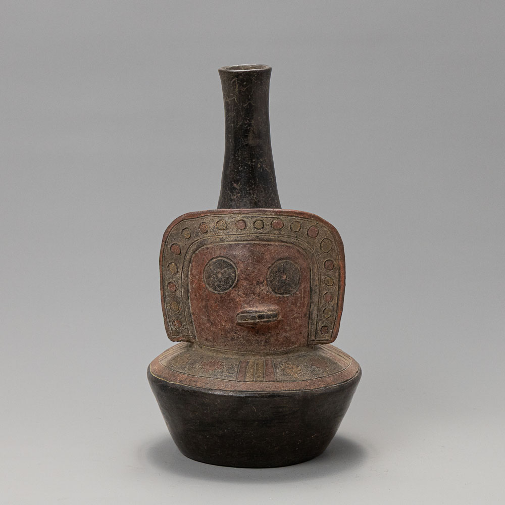 Description: Cupinisque Owl Vessel. North Highlands Peru. Stylized Owl Vessel with Polychrome Colors and Modeling. Presented in the San Pedro Style. The Spout is Vertical and Flares Slightly at the Opening.