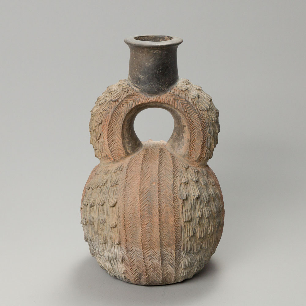 Description: Early Chavin Stirrup-Spout Vessel, Cupisni Que, With Striated And Knobby Sculpted Finish On Bulbous Shape, Matte Finish With Darker Glaze On Neck.