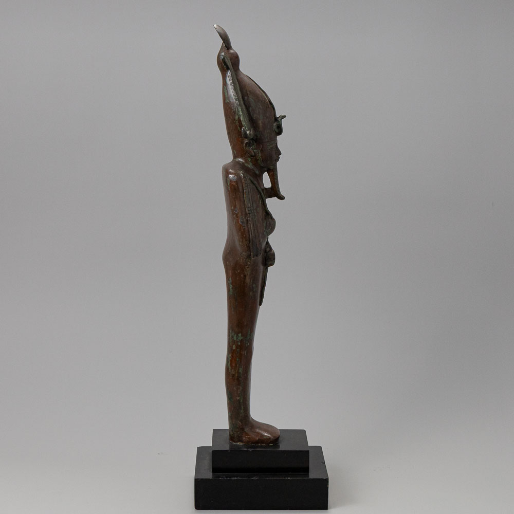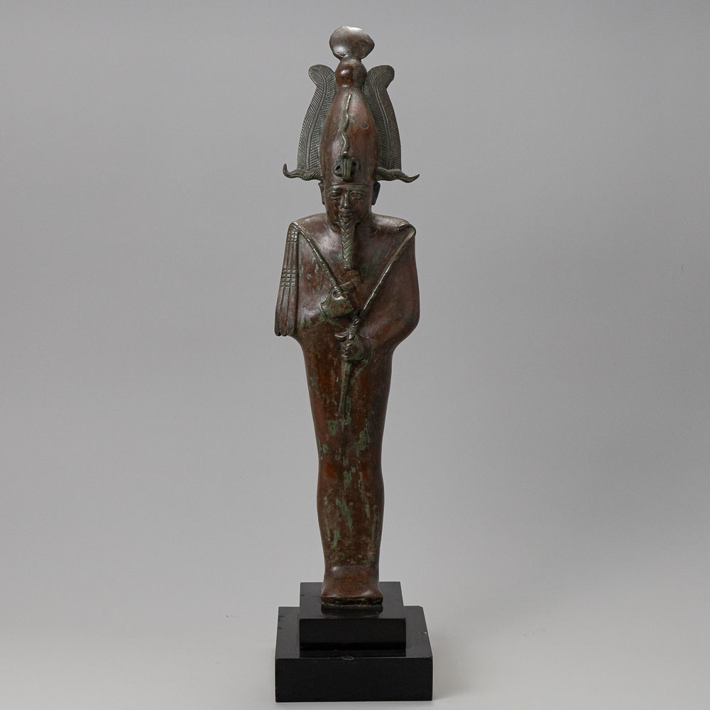 Description: An Egyptian Bronze Osiris. Late Period 26th-30th Dynasty, Circa 664-343 B.C.. His body wrapped in a shroud with only his hands emerging from beneath, wearing the plumed atef-crown with ram’s horns, surmounted by a sun disc and fronted by a uracus, his brows, eyes and mouth well-modelled, the long false beard, crook and flail with finely-incised details.