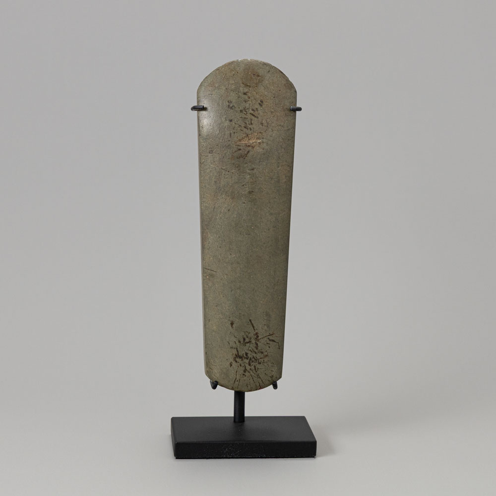 Description: The Tairona Stone Celt, originating from the Northern Andes, is a significant artifact of the Tairona culture. This massive grey-green celts features a smooth, elongated form, reflecting both its functional and ceremonial roles within ancient society. The craftsmanship demonstrates the intricate stoneworking techniques of the Tairona people, showcasing their artistic and cultural sophistication
