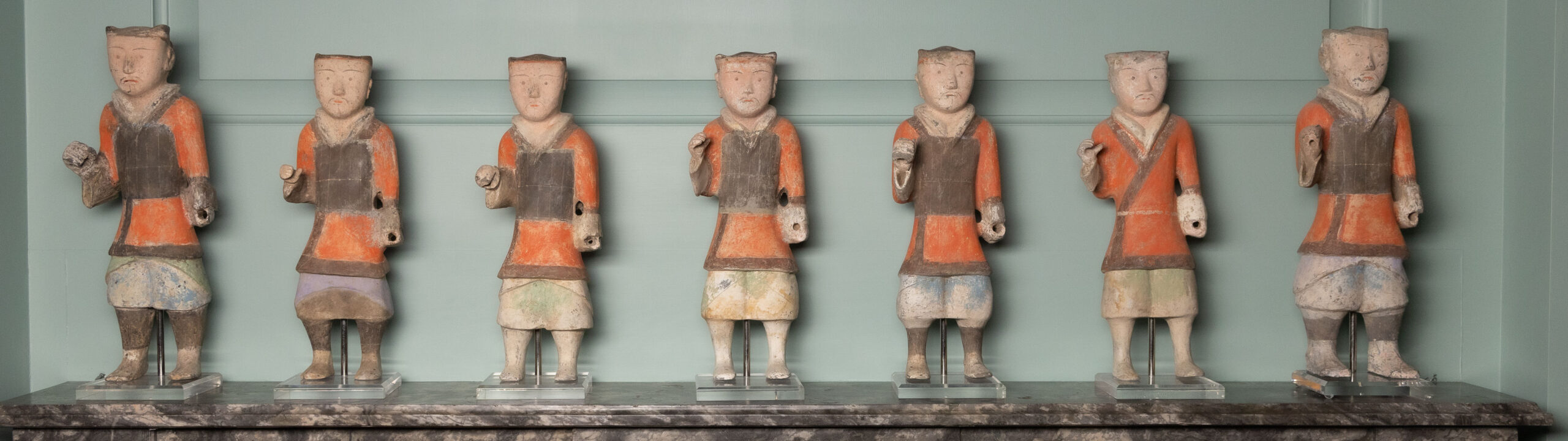 Description: Individual Figurines representing infantrymen in charging position, both hands clasped as to hold a weapon, with their right arms lifted as to carry a spear no longer there, and their left hands along the side; the long tunics pigmented in different colors. The angular faces with individual traits briefly drawn.