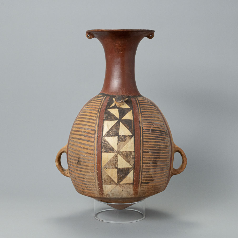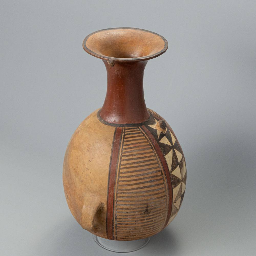 Description: The Inca Ceramic Vessel, known as an aryballos, originates from the Inca culture in Peru. This ceramic vessel stands 14 inches tall and features a flared neck with two small handles. Its body is decorated with geometric designs, including a central band of alternating dark and light triangles, showcasing the intricate artistry of Inca craftsmanship.
