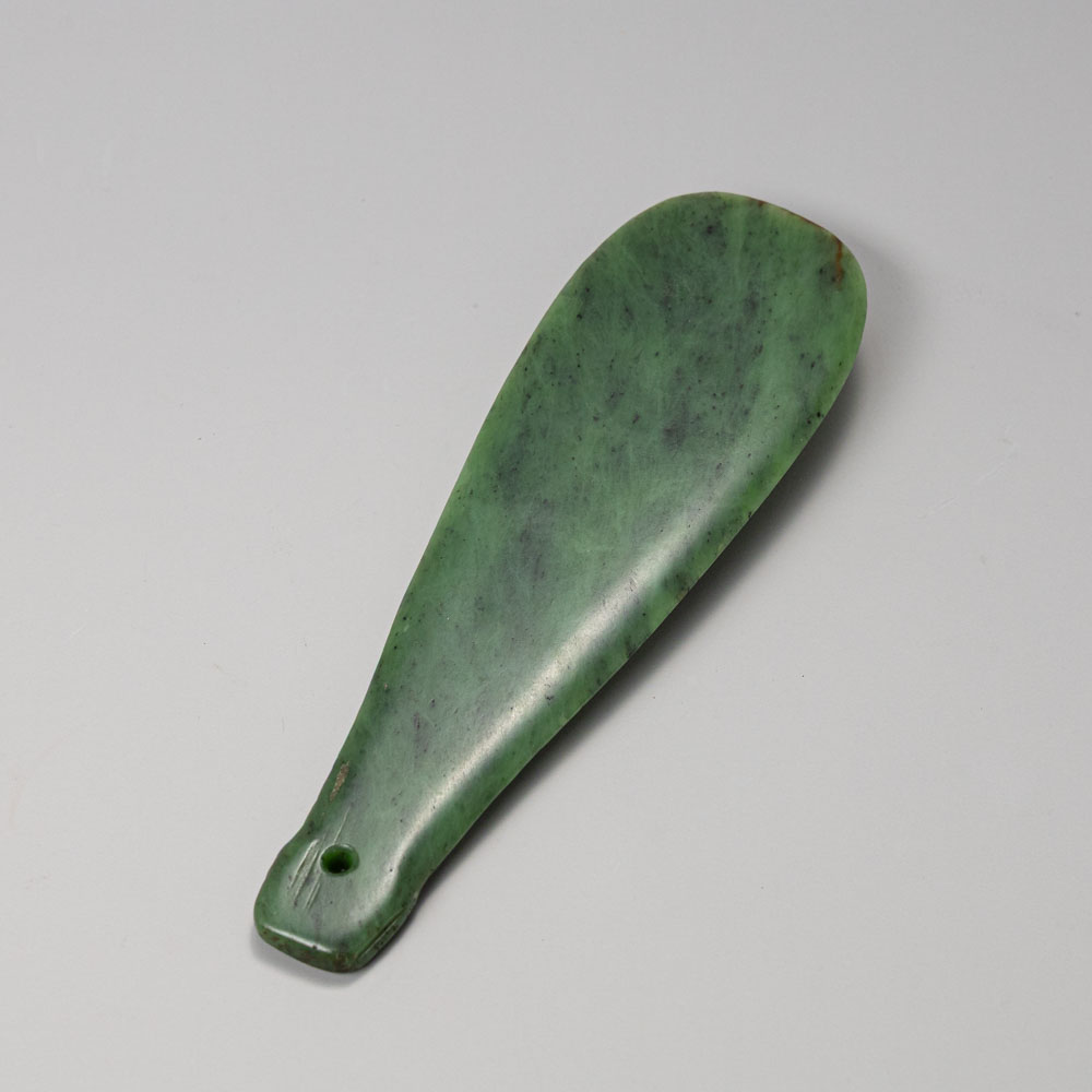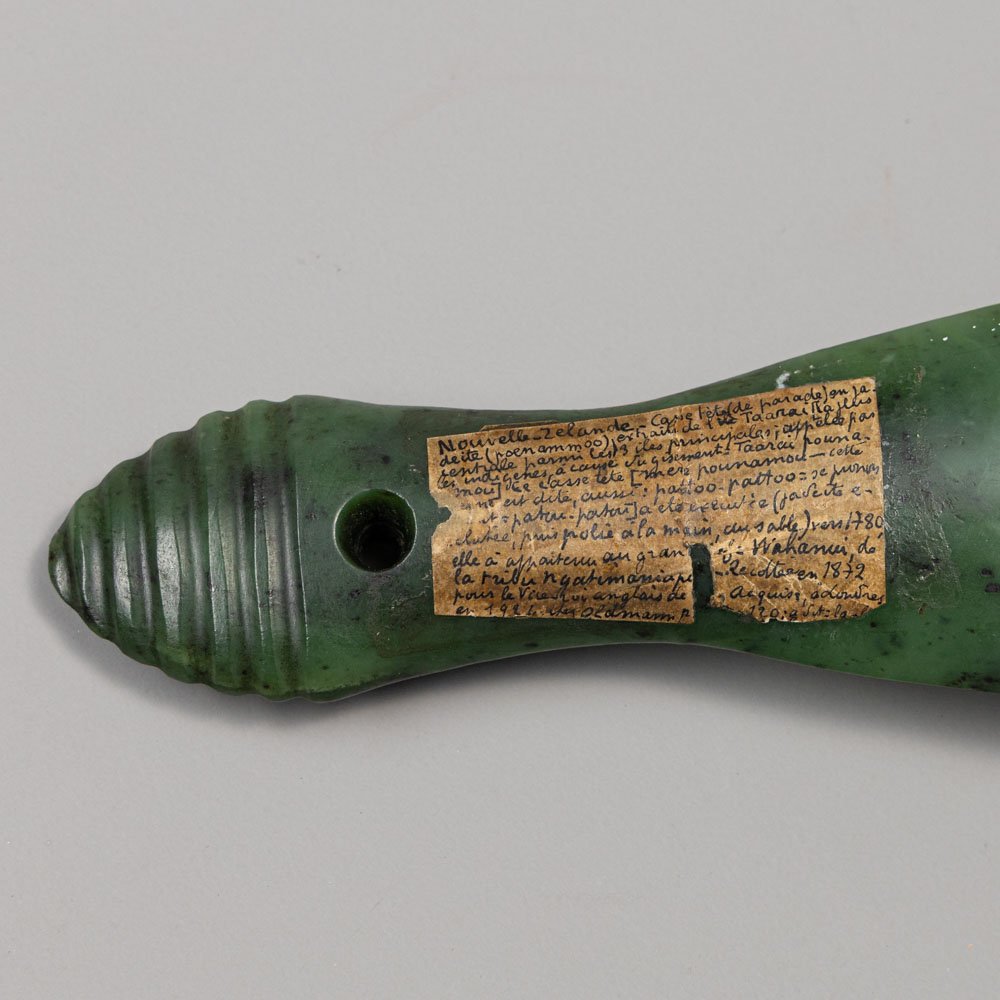 Description: Maori Hand Club. New Zealand. Jade Thrusting and Cleaving Club. Bearing an Old French Label Which Translates as “Belonged to Chief Wahanui of the Tribe of Njatimaniapu.