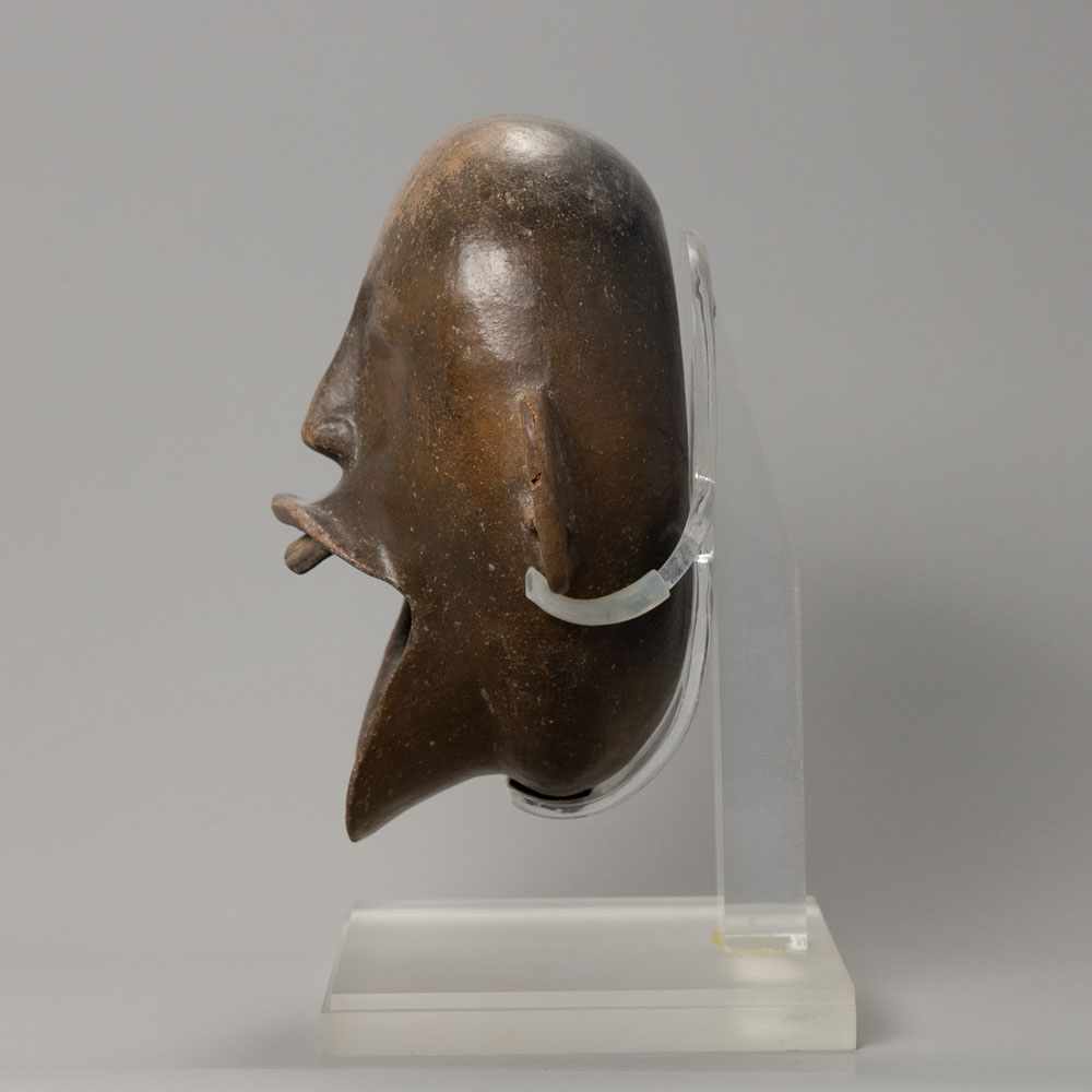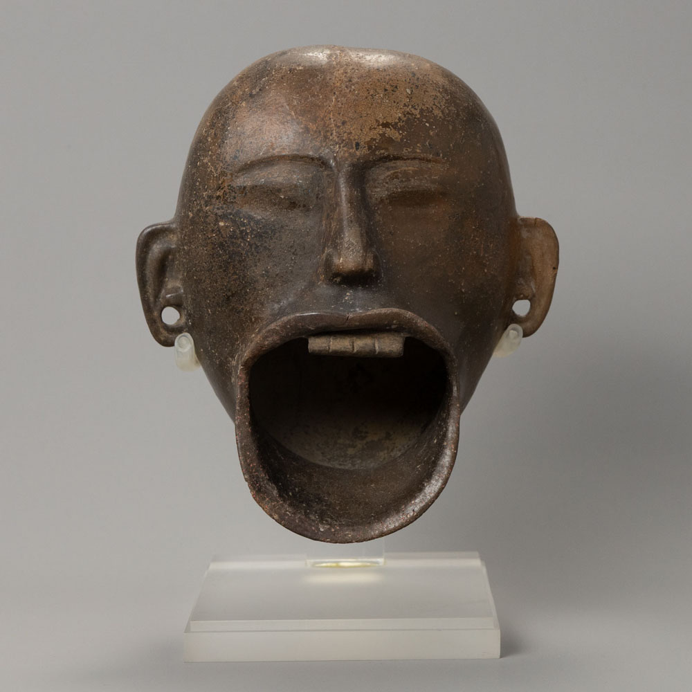 Description: The Maya Terracotta Ceremonial Cup, from the Maya civilization in Mesoamerica, is designed in the shape of a human head with a wide-open mouth. Made from terracotta, this vessel served significant ritualistic purposes, reflecting the cultural practices and beliefs surrounding ceremonies in Maya society.