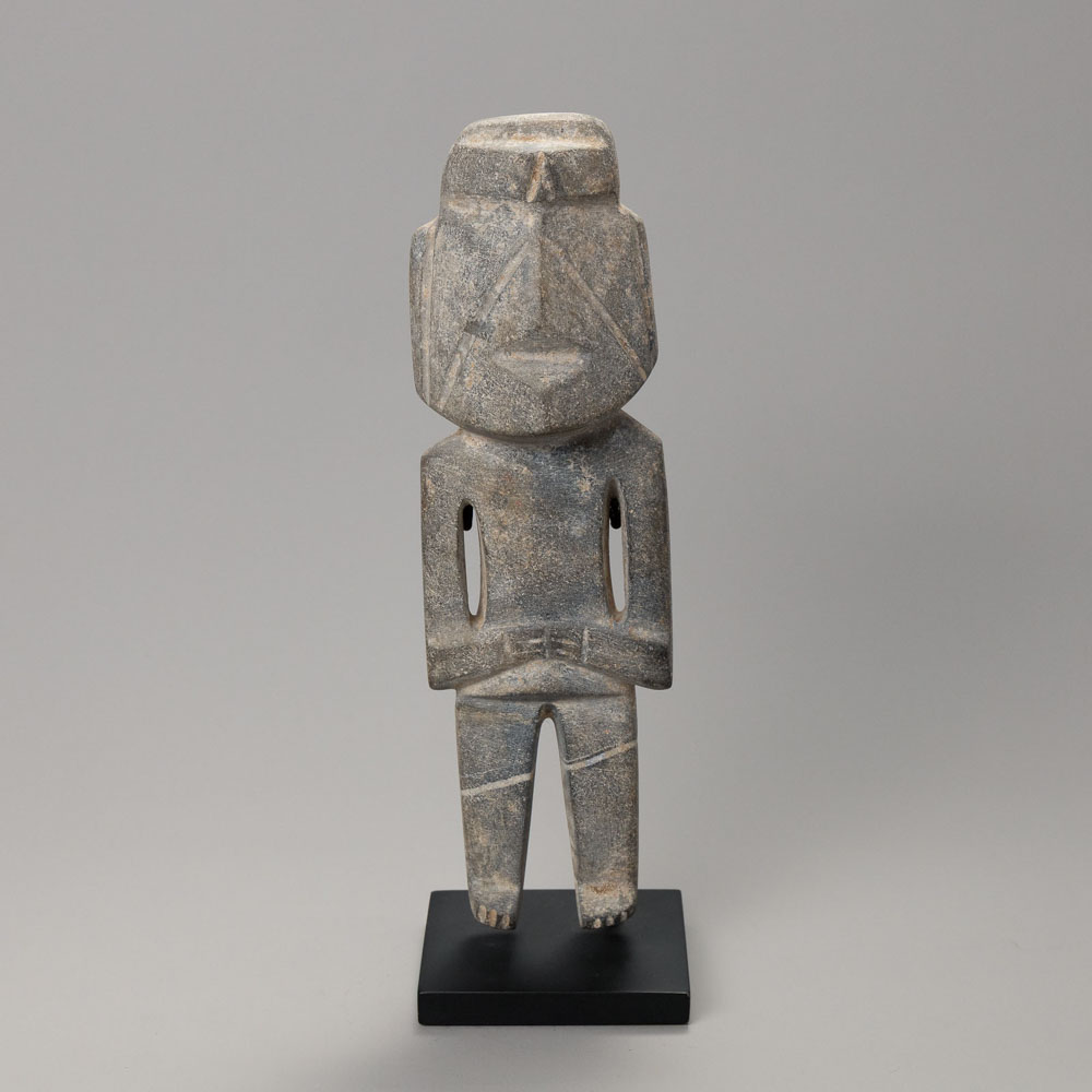 Description: The Mezcal Stone Figure, from the Mezcalá culture of Southwestern Mexico, is a stylized standing figure carved from stone. This artifact reflects the artistic traditions of the Mezcalá people and likely served a ceremonial or symbolic purpose, illustrating the cultural significance of figurative sculpture in their society.