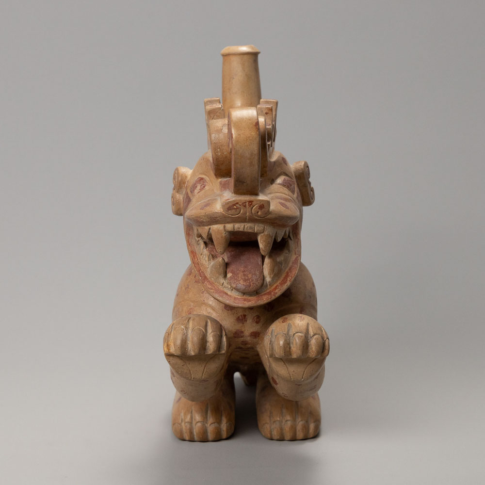 Description: Peruvian Moche Early Vessel Of A Supernatural Figure In the Shape Of A Mooneater. Spotted And Crouching And Feline In Character.