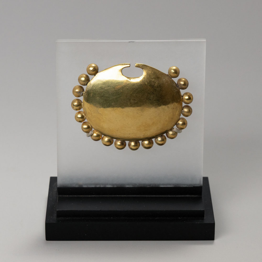 Culture: Moche Region: Peru, North Coast Date/Origin: Circa AD 100–400 Type: Nose Ornament Material: Gold Dimensions: 5.5 x 7 cm Description: Domed sheet-gold nose ornament bordered by eighteen hollow gold spheres individually soldered to the perimeter. The upper edge features a crescent cutout allowing the ornament to rest beneath the nasal septum. Such ornaments were worn by elite individuals and are characteristic of Moche ceremonial regalia. The spherical elements create visual movement and reflect light, emphasizing the wearer’s status during ritual or public display. Provenance: Ex collection Benno Mattel, prior to 1970; by descent to his daughter Karin Ashburn. Illustrated in Oro del Antiguo Peru, pl. 134.