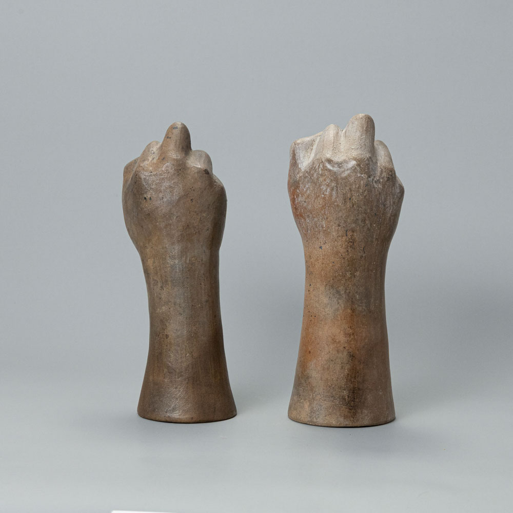 Description: Two Moche Ceramic Vessels in the Form of Hands with Clenched Fists. The Clenched Fist with Raised Middle Knuckle Represents Mountains and Highland Lagoons where Sacrifices and Divinatory Rituals took place.