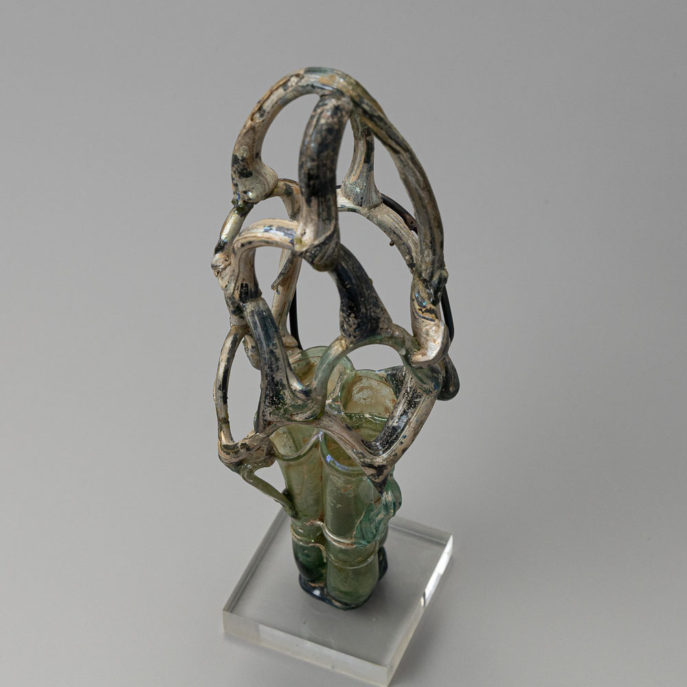 Description: One Roman Green Glass Quadruple Balsamarium. One two handled amphora Roman glass