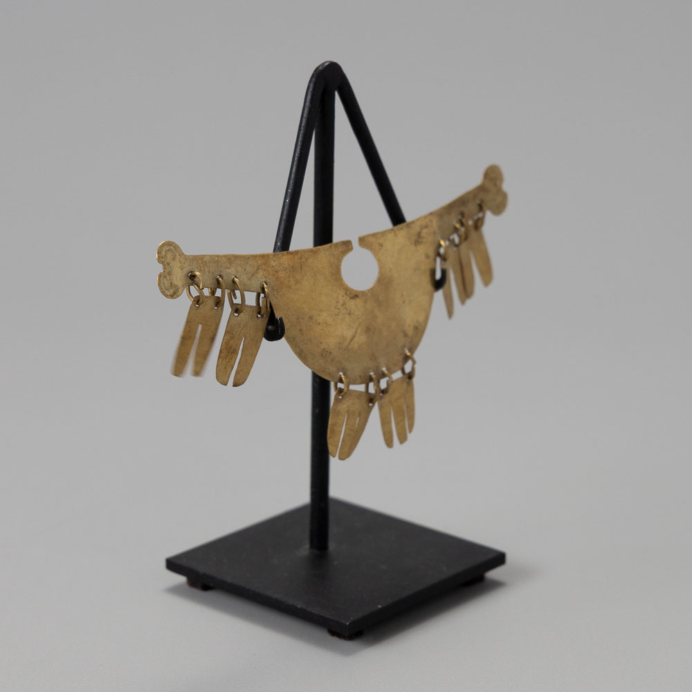 Culture: Moche Region: Peru, North Coast Date/Origin: Circa 200–100 BC Type: Nose Ornament Material: Gold Dimensions: 4 x 1 3/4 in. Description: Salinar–Early Moche gold nose ornament of crescent form with suspended dangles representing stylized bird feathers. The hammered sheet-gold plate is pierced at the center for suspension and terminates in small bird-head finials at each end. Six articulated dangles hang from the lower edge, each shaped as elongated feather elements with stylized bird heads at their terminals, creating movement and sound when worn. The refined sheet-gold work and balanced composition reflect the transitional metalworking traditions between the Salinar culture and the emerging Early Moche tradition on Peru’s north coast. Peru, Virú Valley, North Coast. A rare and visually elegant ceremonial ornament representing early developments in North Coast Andean goldworking and elite adOrnament traditions. ornament representing early developments in North Coast Andean goldworking and elite adOrnament traditions. Provenance: