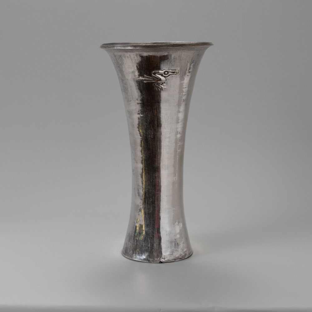 Description: Tall silver beaker with flaring rim, formed from hammered sheet and decorated in repoussé with a stylized avian figure. The elegant proportions and minimal surface ornament are characteristic of Sicán metalwork and elite ceremonial use.