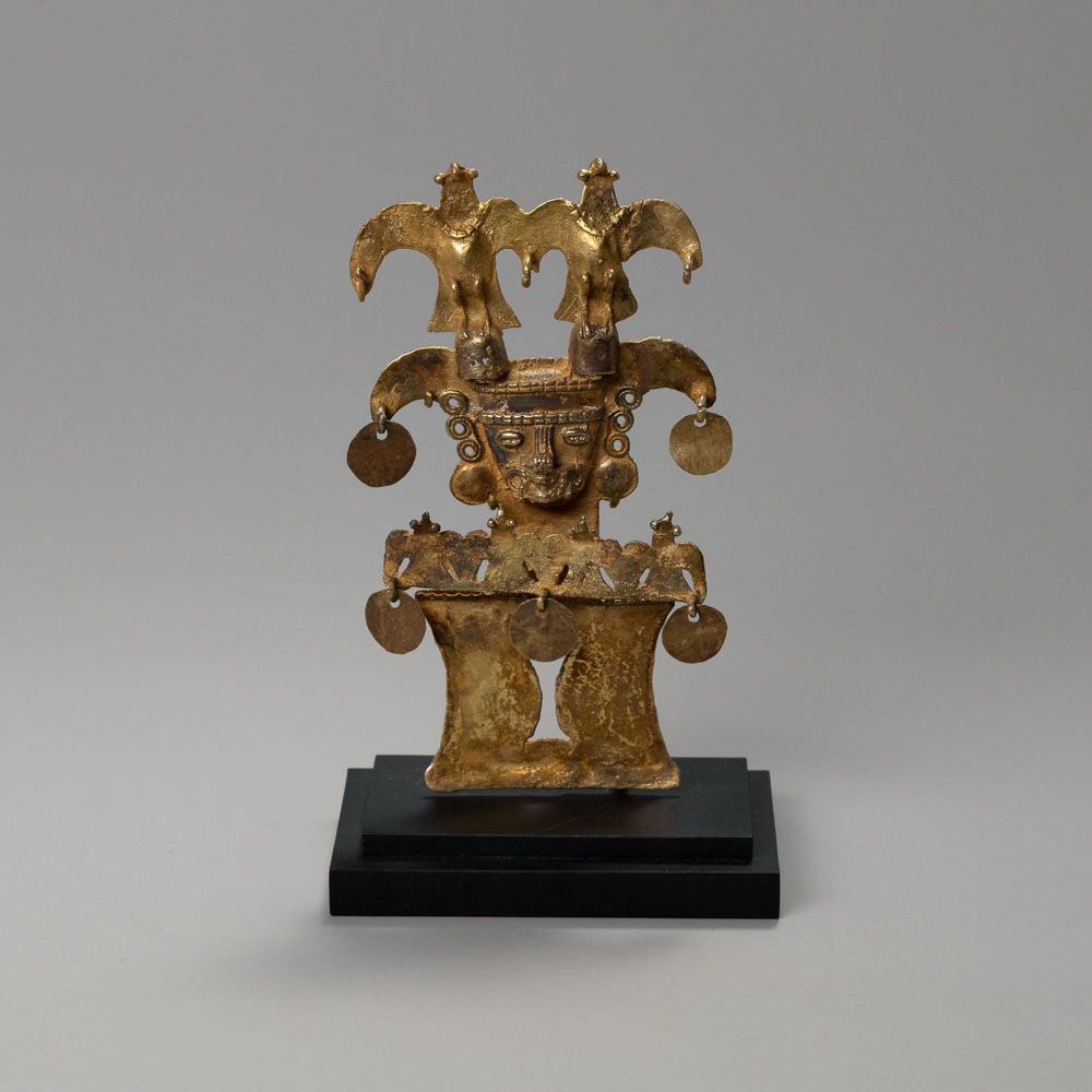 Culture: Tairona Region: Colombia (Sierra Nevada de Santa Marta region) Date/Origin: Circa AD 900–1500 Type: Pendant Material: Gold Dimensions: 5 3/4 x 3 1/2 in. Description: Cast gold pendant depicting an anthropomorphic deity figure wearing an elaborate headdress surmounted by two standing birds with spread wings. Additional avian elements appear in the headdress and along the figure’s chest, accompanied by suspended disc ornaments that would have produced sound and movement when worn. The figure displays a stylized face with prominent nose and ceremonial regalia, reflecting the complex shamanic iconography characteristic of Tairona metalwork. Pendants of this type were worn by elite individuals as powerful insignia of rank and spiritual authority. Weight: 81 grams. Provenance: Colombia, Gulf of Urabá region (collection attribution).
