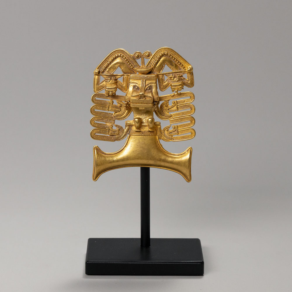 Culture: Region: Colombia Date/Origin: Circa AD 900-1500 Type: Pendant Material: Gold Dimensions: 3 5/8 in. Description: Finely cast gold pendant representing a composite bat–jaguar figure, combining avian-like wings with feline facial elements. Such hybrid beings are characteristic of Tairona cosmology, symbolizing shamanic transformation and the connection between earthly and supernatural realms. Pendants of this type were worn by elite individuals as insignia of status and spiritual authority. A refined example valued for its intricate openwork design and strong iconographic presence. Provenance: