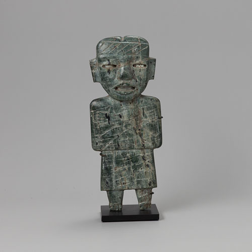 Description: The Teotihuacan Stone Figure, crafted from green schist, exemplifies the distinctive artistic style of the Teotihuacan culture in Central Mexico. This striking figure features a stylized human form with detailed facial expressions and clothing, reflecting the cultural significance and craftsmanship of the era.