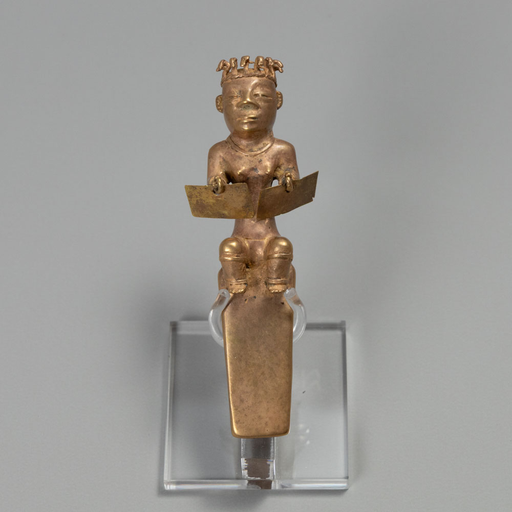 Culture: Urabá Region: Colombia Date/Origin: Circa AD 700–1000 Type: Pendant Material: Gold (tumbaga alloy) Dimensions: Description: Cast gold pendant of the Urabá region depicting a seated female figure positioned atop a long tapered plank. The figure is shown with bent knees and arms extended forward holding two sheet gold rectangular danglers. The head is finely modeled with expressive facial features and an elaborate headdress composed of upright curved elements. Pendants of this type were worn as elite ornaments and reflect the sophisticated casting traditions and symbolic imagery of ancient Colombian goldwork. A striking example with strong sculptural presence and refined detailing. Provenance: Private West Coast collection.