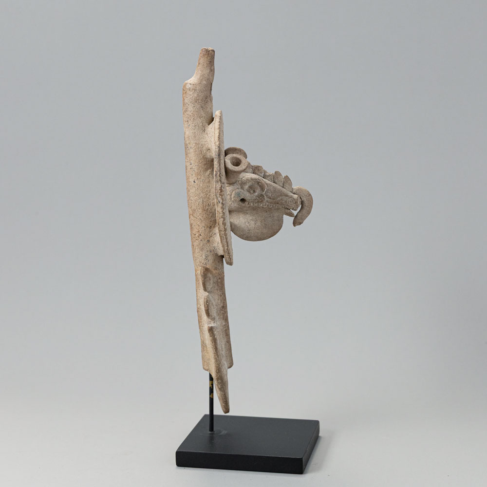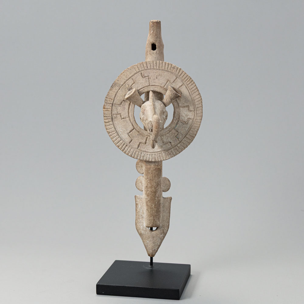 Description: Veracruz Figural Whistle Depicting a Mythical, Zoomorphic Head within a Central Disc, Decorated with an Incised Geometric Pattern.