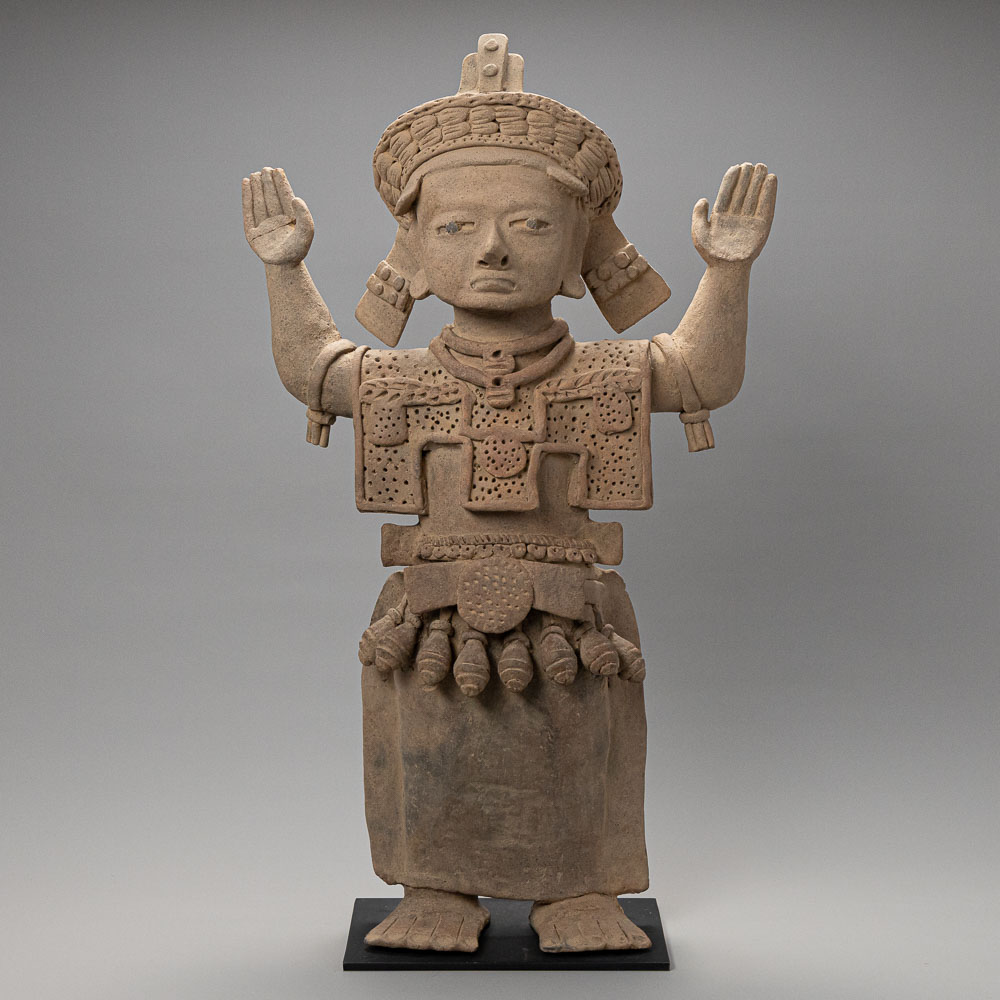 Description: The Veracruz Pottery Figure is a Pre-Columbian ceramic sculpture from the Veracruz culture. It depicts a standing figure adorned with intricate ceremonial attire and raised hands, likely representing a ritual or ceremonial role. The craftsmanship reflects the artistic traditions and cultural significance of the Veracruz civilization, emphasizing their ritual practices