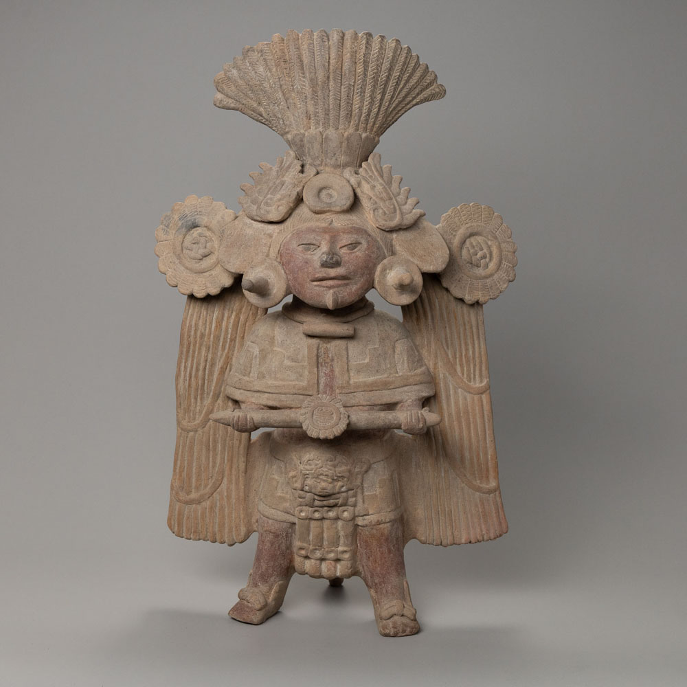 Description: The Veracruz Terracotta Figure is a remarkable artifact from the Veracruz culture. Crafted from terracotta, this figure features an elaborate fan-like headdress and holds a horizontal object across its chest. The intricate details reflect the artistic traditions of the time, highlighting its significance in the study of Pre-Columbian art.