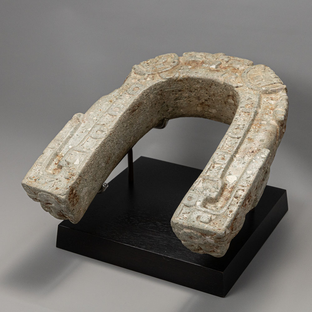 Description: The Veracruz Stone Yoke is a beautifully carved artifact from the Veracruz culture, made of stone. It features intricate designs, including stylized faces and geometric patterns, showcasing the artistic craftsmanship of the era. This yoke was likely used in ceremonial contexts, reflecting the cultural significance of such items in Veracruz society.