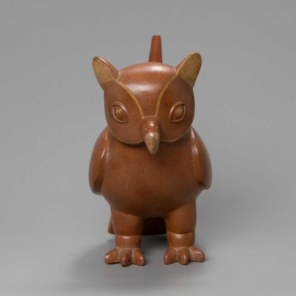 Description: The Vicús Ceramic Stirrup Vessel is a decorative pottery piece from the Vicús culture of North Coast Peru. It is crafted in the form of a stylized bird, featuring a prominent spout and striped body details. This vessel exemplifies the artistic traditions of the Vicús people, likely used for ceremonial or practical purposes.