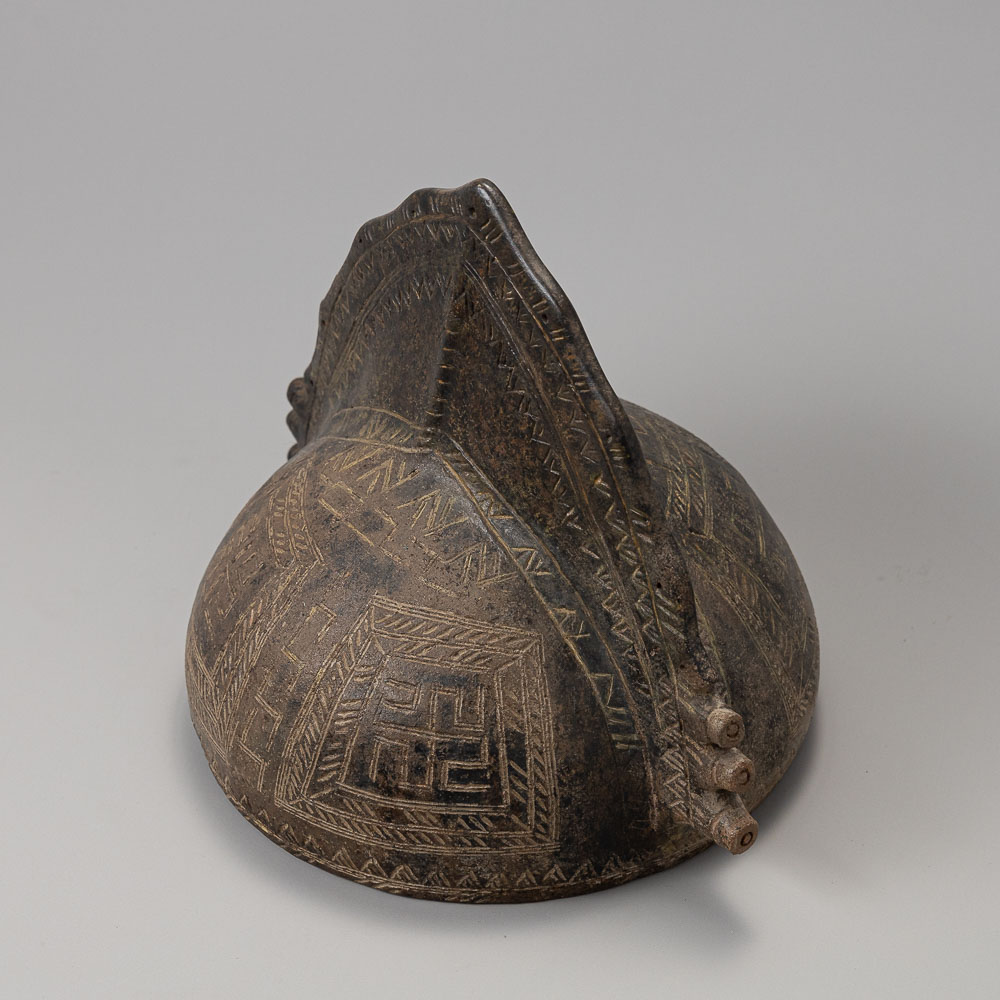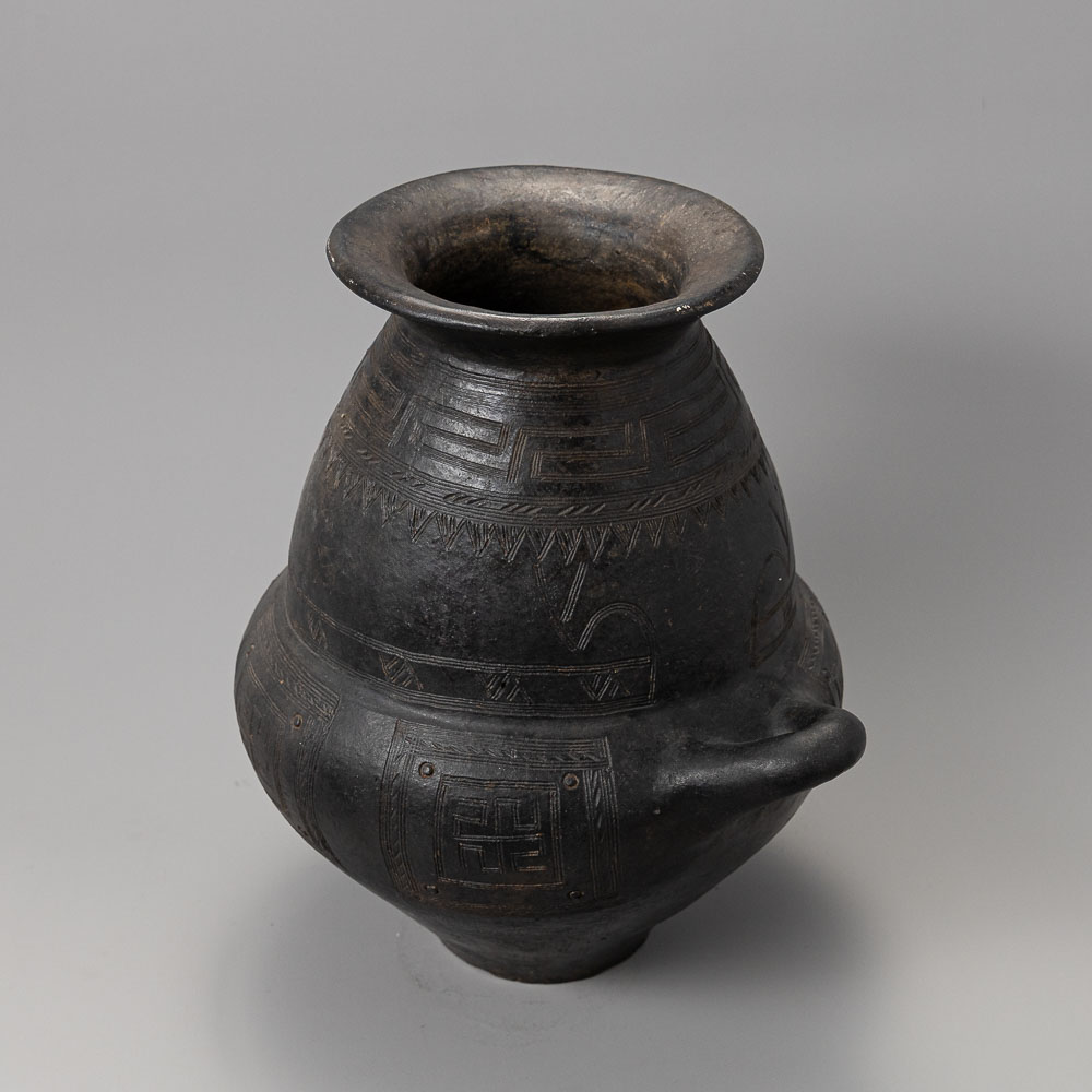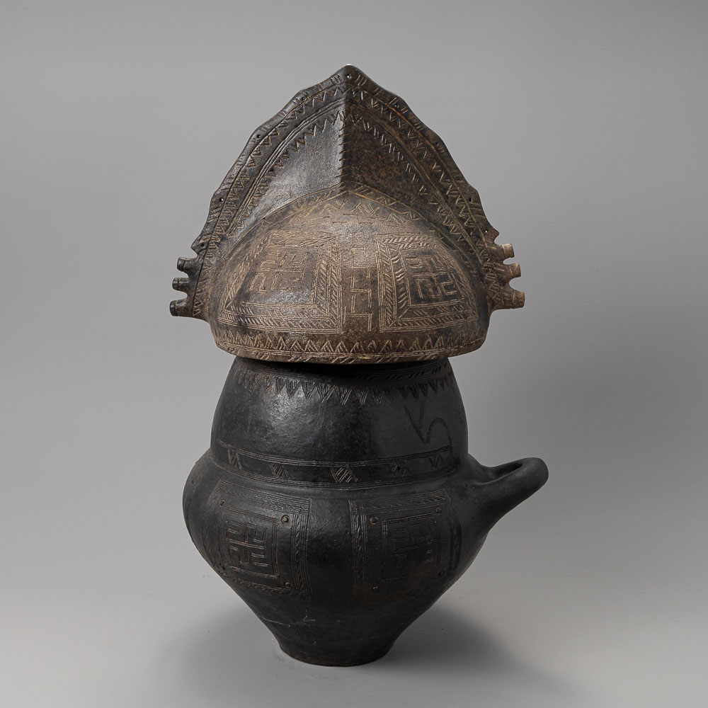 With a handle on one side, a flaring rim, and incised geometric designs of meanders, triangles, hatched fields and swastikas. The lid with similar incised decoration.