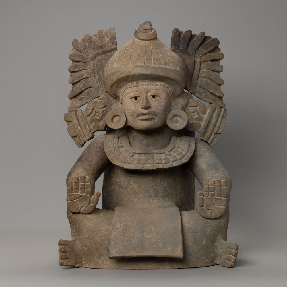 Description: The Zapotec Ceramic Figural Urn is a significant artifact from the Zapotec culture of Southern Mexico. Made of ceramic, it depicts a seated figure adorned with an elaborate headdress, showcasing the artistic style of the period. This urn highlights the cultural and ceremonial importance of such figures in Zapotec society.