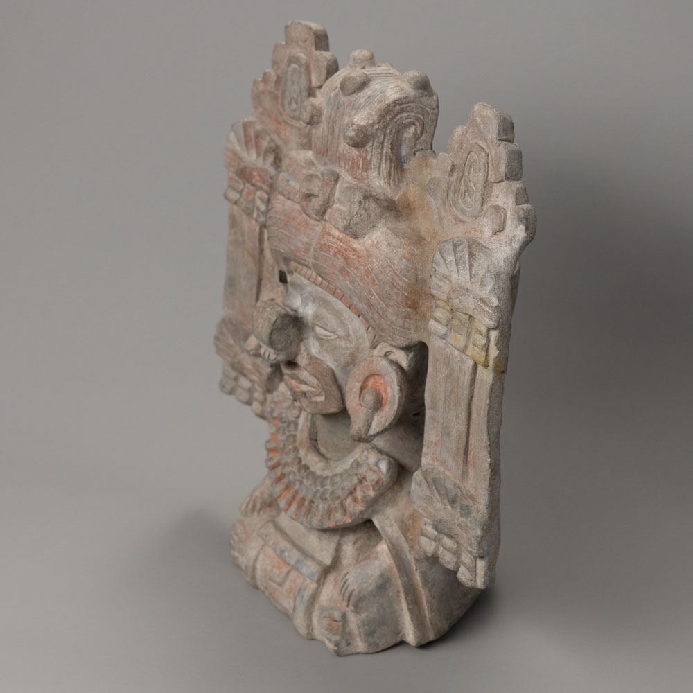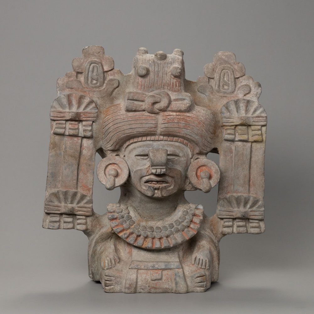 Description:The Zapotec Terracotta Deity Figure is an ornate, stylized sculpture made of terracotta, depicting a seated figure adorned with a complex headdress and large ear spools. The figure features an elaborate necklace and intricate details characteristic of Monte Albán Zapotec artistry. Its expressive facial features and detailed embellishments reflect the cultural significance and craftsmanship of the Zapotec civilization from Southern Mexico.